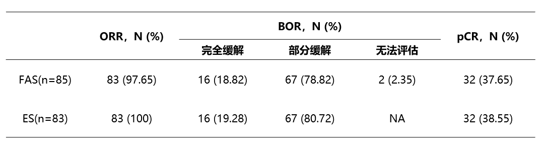 全分析集(FAS)85例患者ORR为97.65%,其中,16例为CR,pCR率为37.65%。2例患者接受卡瑞利珠单抗治疗后退出,未进行影像学评估。在疗效可评估人群(ES)中,所有患者疾病均得到缓解,ORR为100%,pCR率为38.55%。